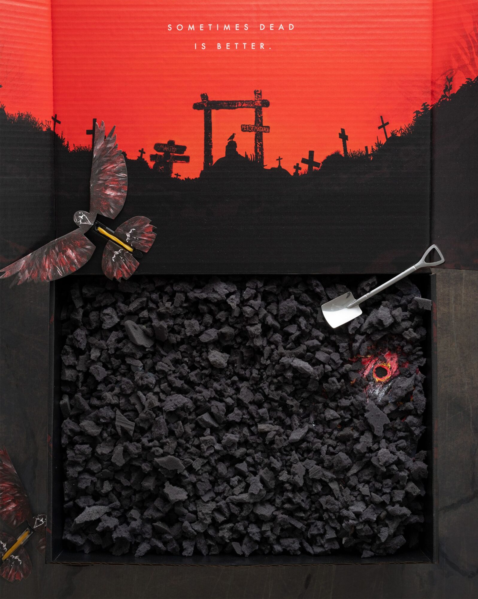 The immersive unboxing experience begins with a fright. TPD designed and fabricated spring-loaded crows that burst into flight as the box lid opens delivering a thrilling jump scare.