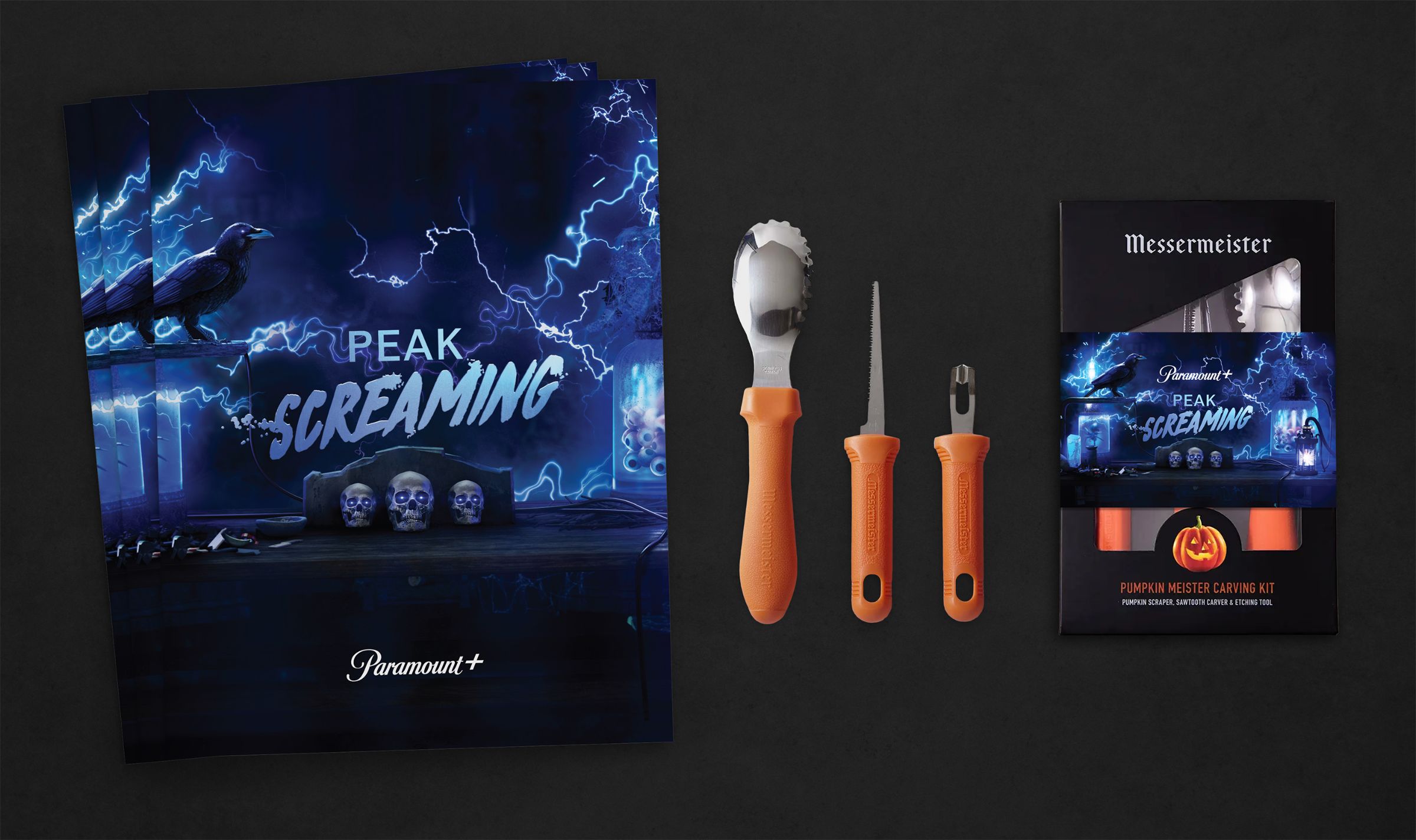 Paramount+’s seasonal content includes thrilling titles like Yellowjackets and the Scream franchise. To highlight these shows and movies, TPD created an exclusive booklet of custom pumpkin carving templates and tool set to entertain all ages.